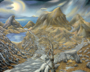 Resting on a green terrace in the shade of a large tree, above a quiet lake. The rock formations are crystalline, painted with cadmium reds and magentas. It is a secluded place that I envision and where wish to be, a place of peace and beauty. It is painted on a French Polyester canvas stretched over a mahogany panel and measures 40 x 30 inches. The brush work is invisible.