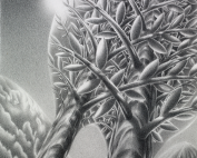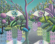 This is undoubtedly the most complex of my work. Painted on French polyester canvas stretched over a mahogany panel, it measures 40 x 30 inches. It is a self portrait of my consciousness, where my face fits perfectly within the shape of a crystal, where my neck is the trunk of a tree, my hair its foliage and my face the inside of a room. These superimposed layers required much sketching and five to six months of work, where the brushwork aims to be invisible. I painted what I see and feel.